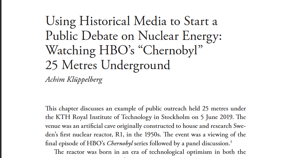 In 2023, a team of curious researchers got together to explore the field of Public History. Together, we checked our fields of expertise for applications within the sphere of Public History. The result were many exciting discussions and a beautiful edited volume. “Public History in Action. Past and Present Practices of Making History Public” was published in cooperation with Opuscula Historica Upsaliensia. My dear colleagues Armel Cornu, Carl-Filip Smedberg and Sarah Vorminder worked tirelessly as editors to realise this project. I contributed a chapter about a scenic viewing of HBO’s miniseries “Chernobyl” in former R1’s reactor hall, 25 metres underground at KTH Royal Institute’s main campus in Stockholm.